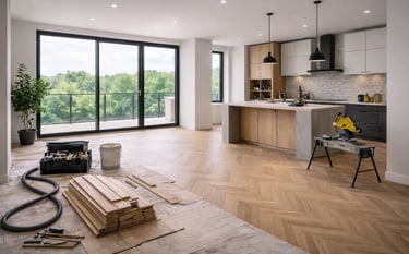Transformation complète d’un salon ouvert avec cuisine en un espace lumineux et fonctionnel, alliant matériaux naturels et équipements modernes.
