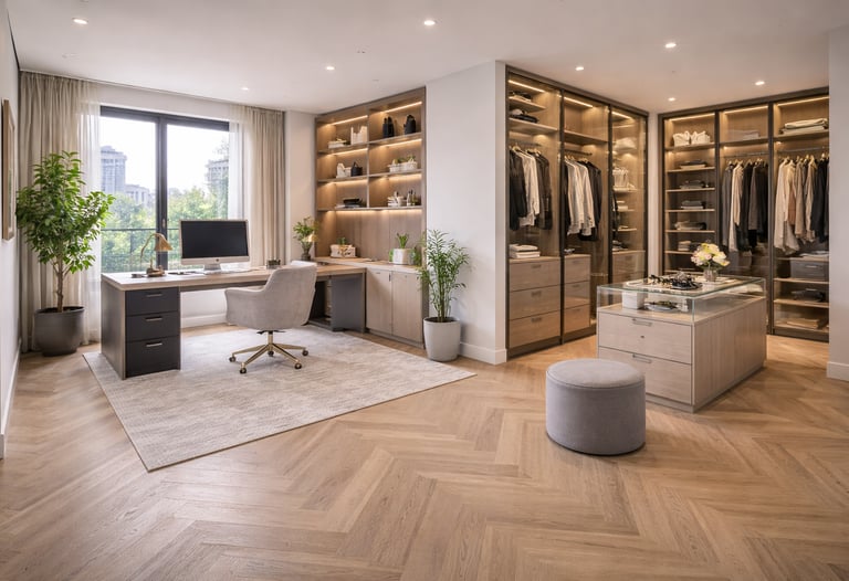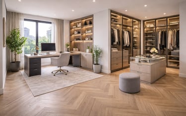 Aménagement sur mesure d’un bureau/dressing, optimisant la lumière naturelle et le confort pour une meilleure productivité.